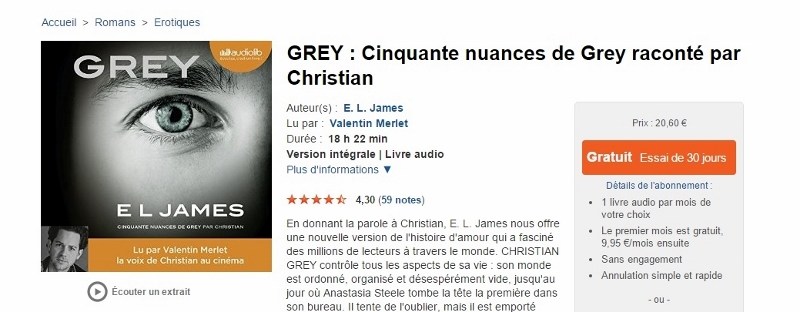 Alors franchement, ça marche super BIEN ! Ça le fait à fond ! J’ADORE. Pour ceux et celles qui ont aimé la première trilogie de 50 nuances de Grey et qui ont aussi apprécié le film, si vous cherchez un premier livre audio, allez-y, FONCEZ !!!!