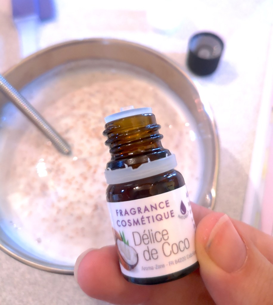 Pour terminer, on y ajoute 2ml de fragrance. Personnellement, j’ai choisi Délice de coco pour parfumer ma crème de douche. Vous pouvez donc choisir celle que vous voulez et le choix de fragrance est très diversifié chez AROMA-ZONE.