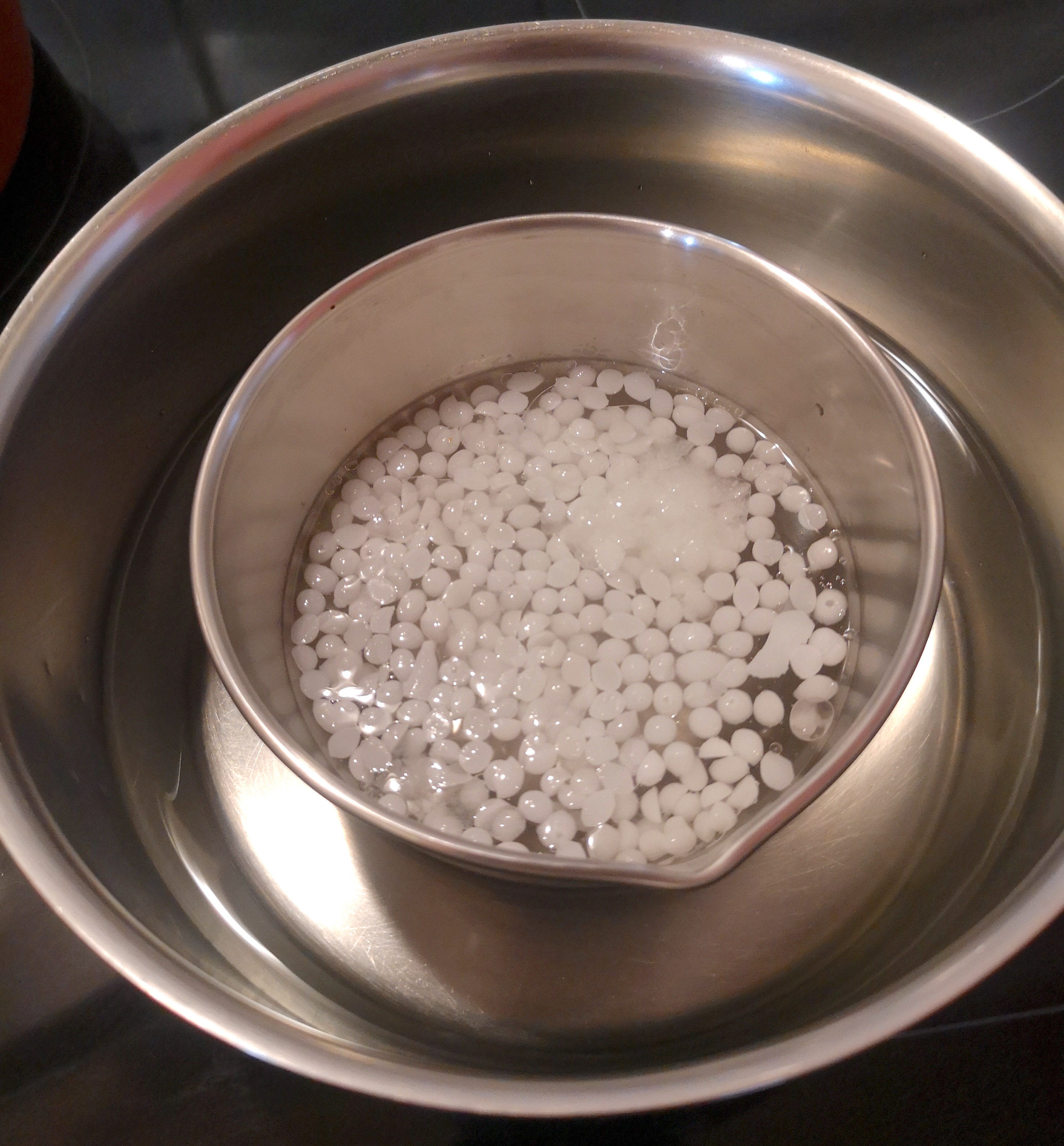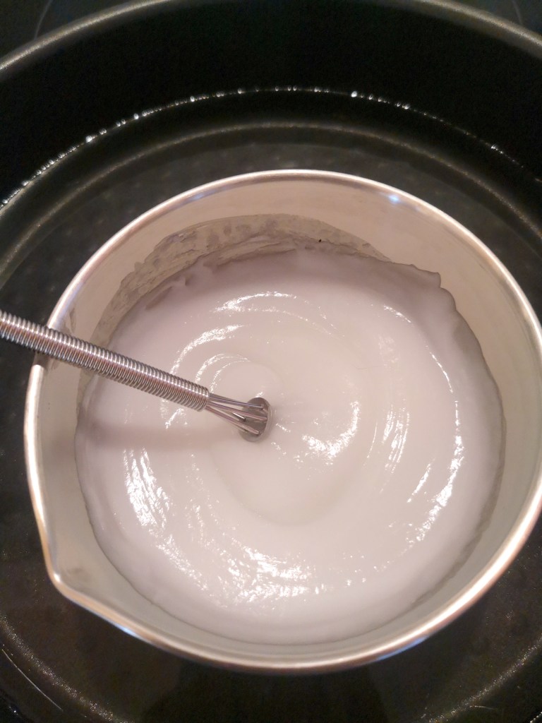 On commence par mettre le monoï et l’émulsifiant dans un bol avec de l’eau minérale, puis on chauffe le tout au bain-marie. Lorsque l’émulsifiant aura totalement fondu, il suffira de sortir de bol du bain-marie.