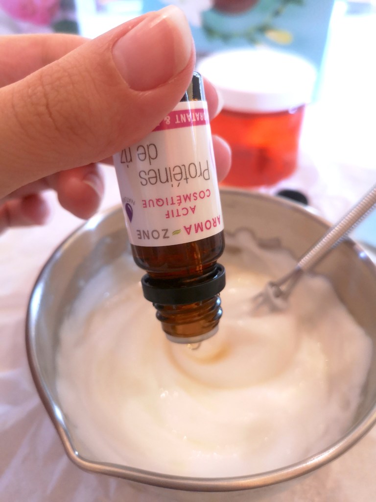 On termine en ajoutant les protéines de riz, la fragrance monoï puis le conservateur cosgard. On mélange encore un peu puis on transvase la préparation dans le pot prévu à cet effet.