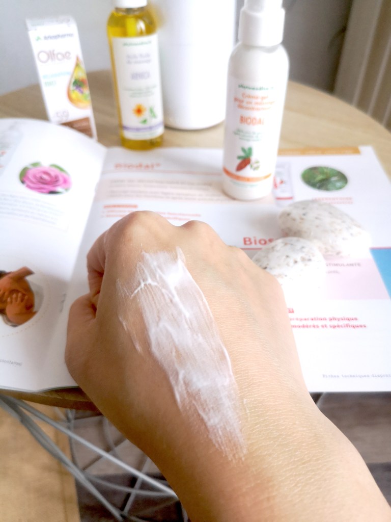 On l’applique très simplement, grâce à un léger massage circulaire, jusqu’à pénétration complète. Pour que le massage soit bien efficace, je vous conseille d’utiliser vos deux mains (surtout si vous l’appliqué sur des zones étendues, comme moi).