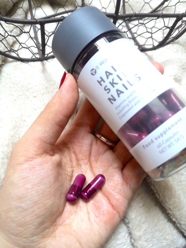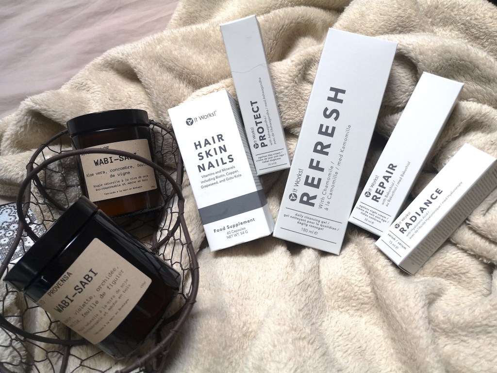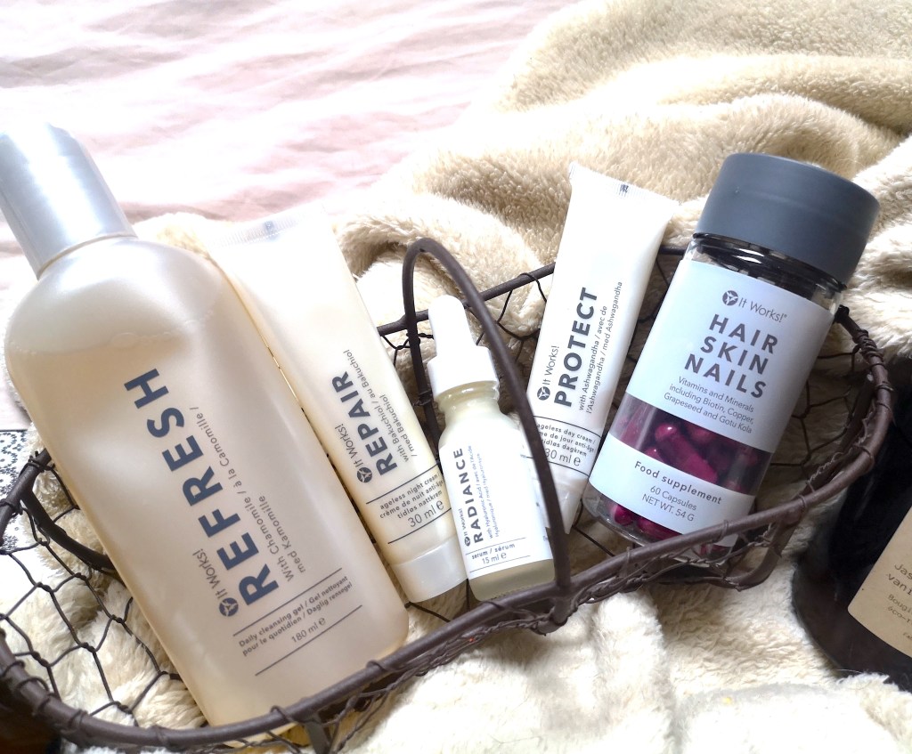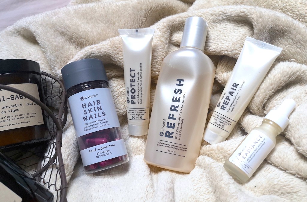 On est donc sur une routine à base de quatre produits soins, à laquelle It Works a ajouté un complément alimentaire : le fameux Hair Skin Nails dont je vous ai déjà parlé de nombreuses fois par ici 😉 Voici donc les différents produits qui composent cette gamme de produits visage :