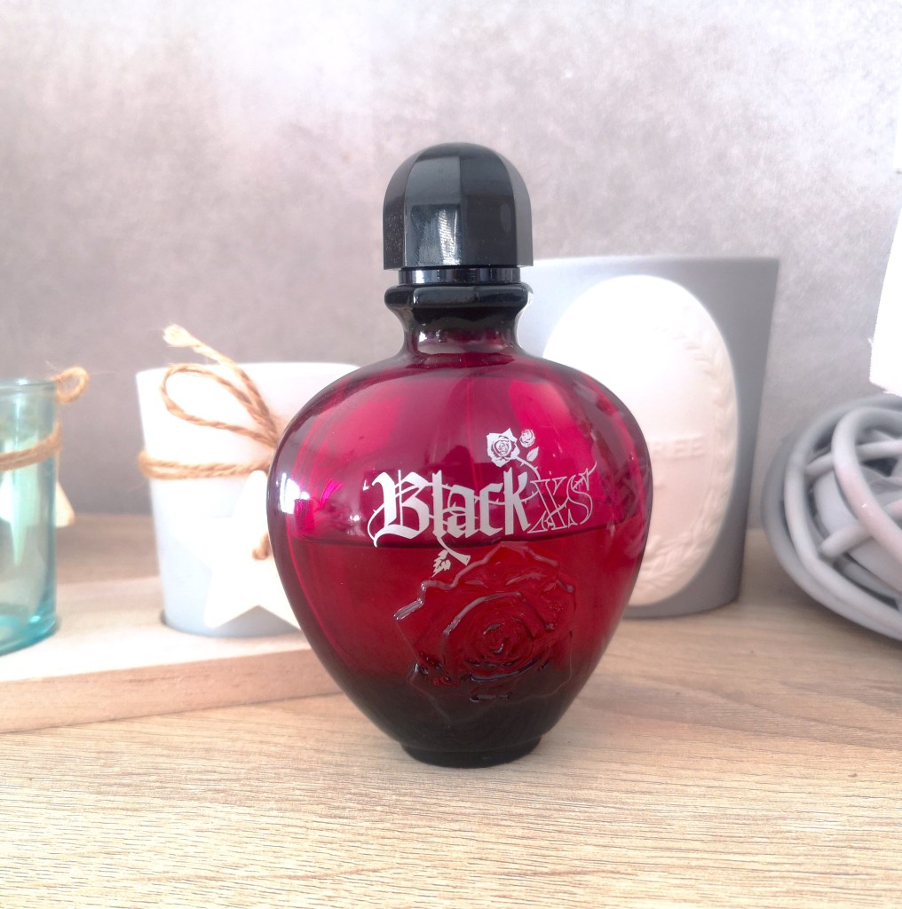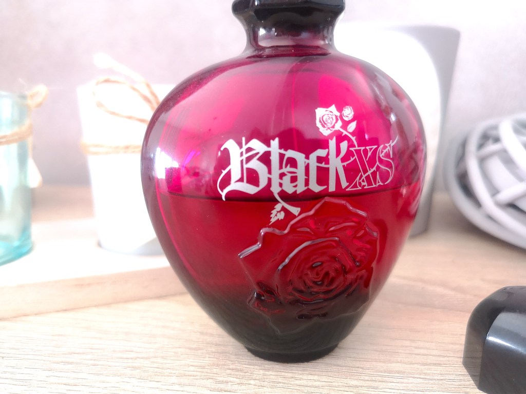 Le flacon de Black XS pour elle s’habille d’une teinte noire et rouge/orangée, donc légèrement différents du flacon Black XS d’origine. La senteur est beaucoup plus fleurie. On sent vraiment bien le côté fleurs blanches. Le côté boisé vient clairement en fond et pas immédiatement. On le retrouve après plusieurs heures…