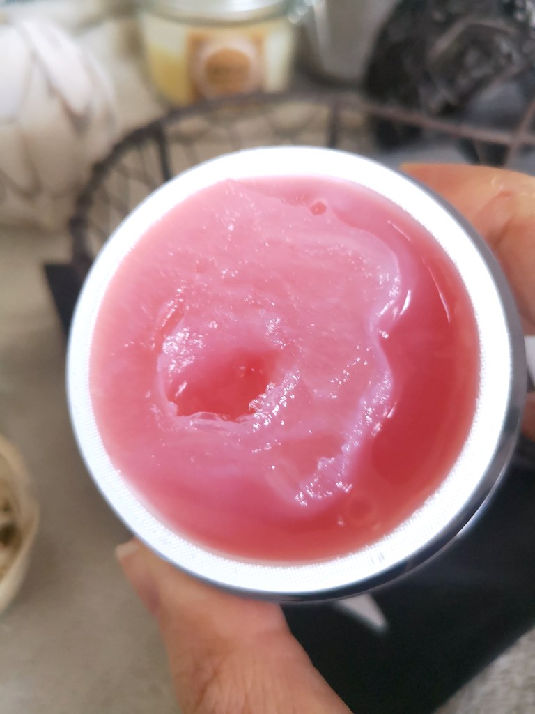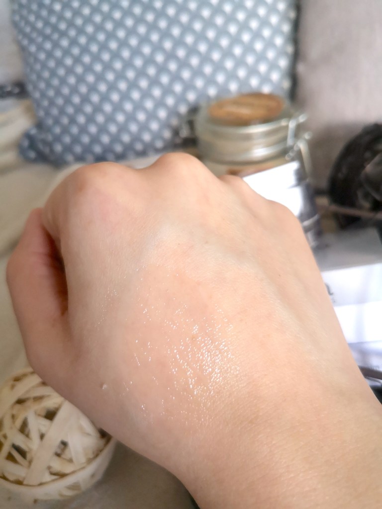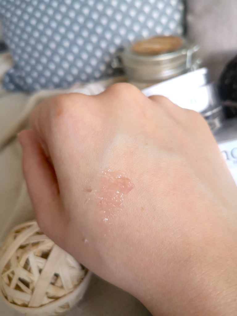 La texture est vraiment très surprenante… On est sur un baume à la texture fondante avec une odeur légèrement fruitée. En l’appliquant sur le visage, la texture se transforme en une texture huileuse très douce. Elle est très facile à rincer et ne laisse aucune trace de son passage sur la peau (elle ne laisse aucun voile huileux sur le visage, et c’est très agréable !).