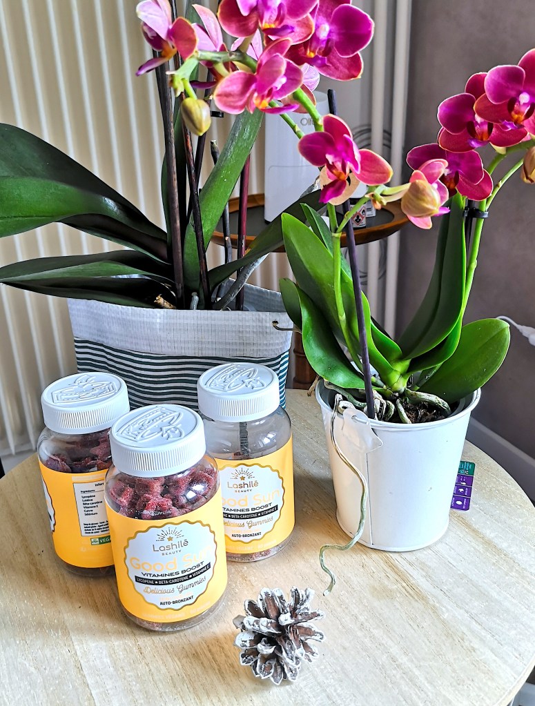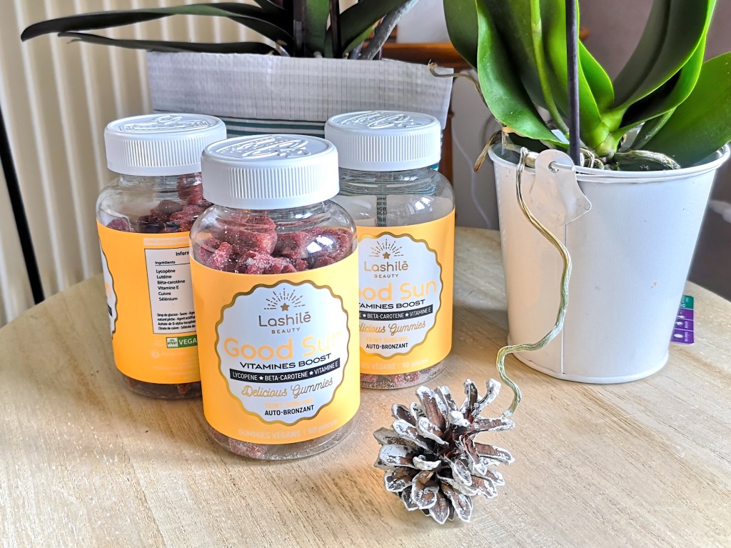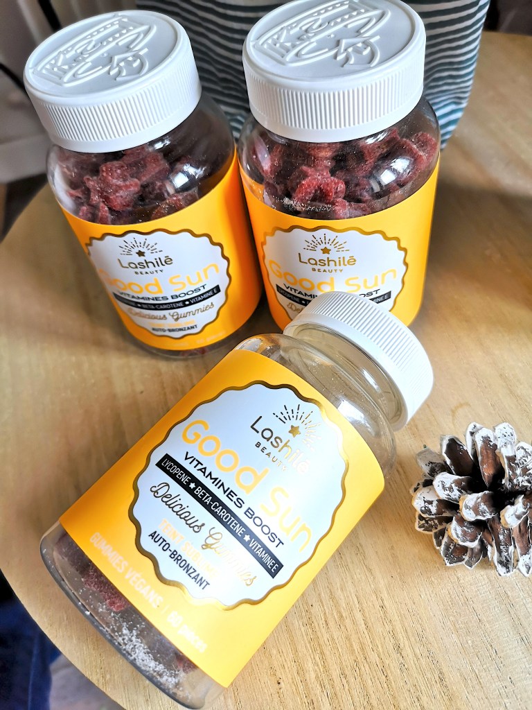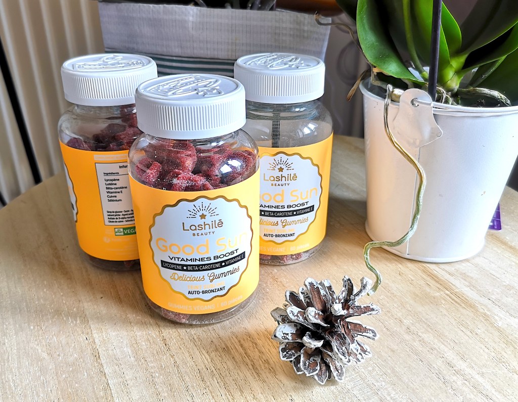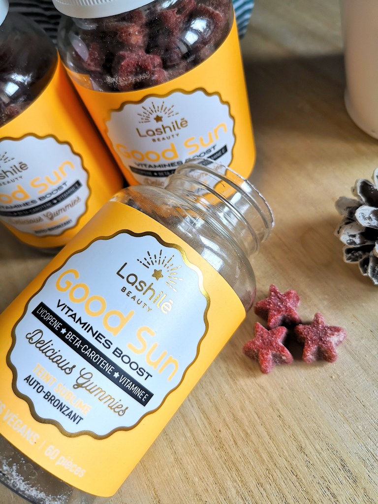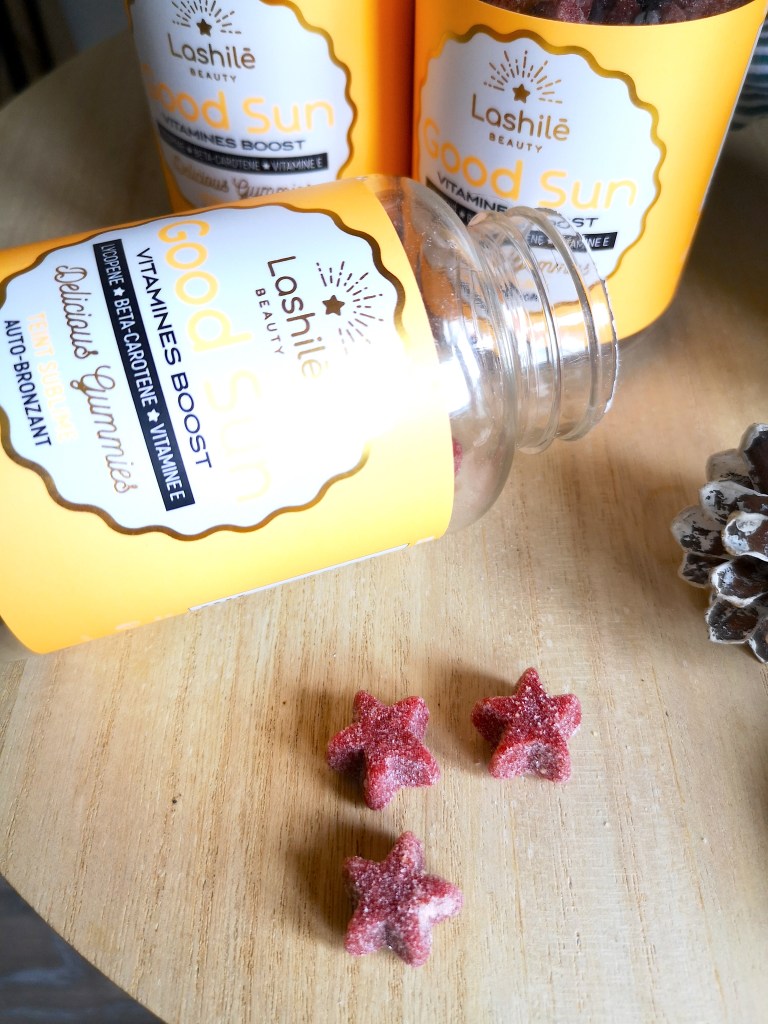 Les entreprises travaillant en nutricosmétique proposent des compléments alimentaires, généralement à base d’ingrédients d’origine naturelle, pour sublimer la peau, les cheveux et les ongles. En fait, c’est une nouvelle génération de produits de beauté ! Ils peuvent prendre différentes formes : gélules, comprimés, pastilles… Ici, ce sont des gummies. À l’origine, Lashilé Beauty proposait uniquement le complément alimentaire Good Hair pour la pousse des cheveux et finalement neuf cures existent aujourd’hui, dont la cure Good Sun.