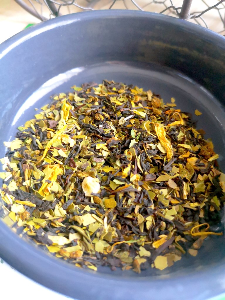 C’est un mélange de thés noirs de la région de Assam en Inde du sud et de maté vert. Il est complété de gingembre, écorces de citron et de fleurs (bleuet, souci).